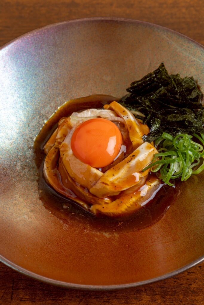 大和肉鶏を紀州備長炭の炭火で表面をサッと焼き、淡路島の玉葱と龍のたまごと自家製の甘辛だれを合わせた逸品。